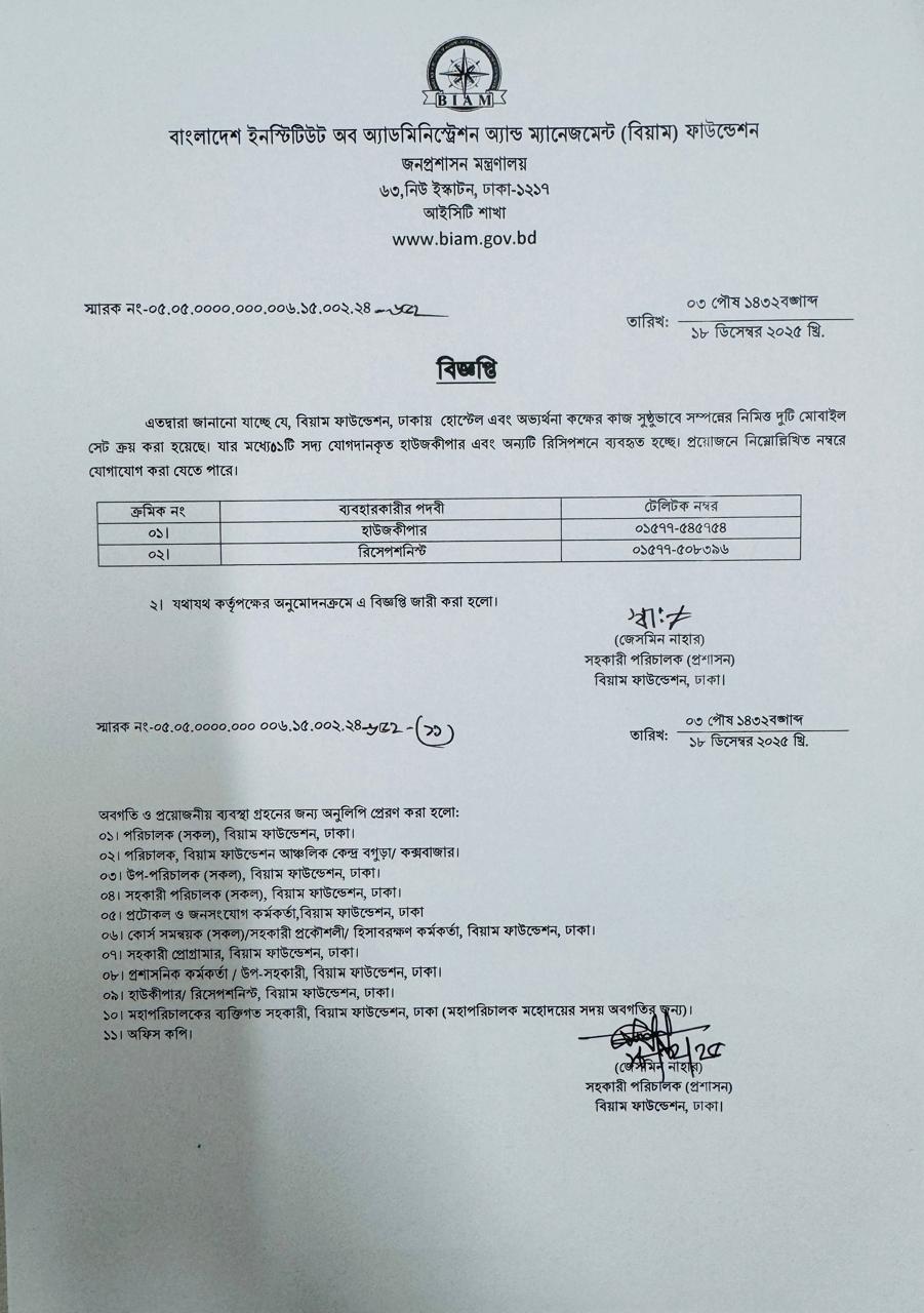 | ৮ | হোস্টেল ও রিসিপশনে ব্যবহৃত মোবাইল নম্বর প্রচার সংক্রান্ত বিজ্ঞপ্তি | | | ১৮-১২-২০২৫ | দেখুন |