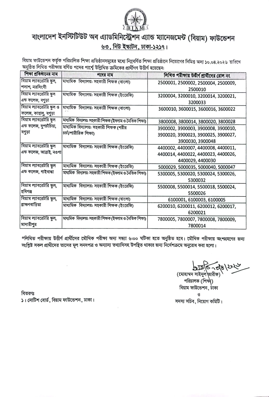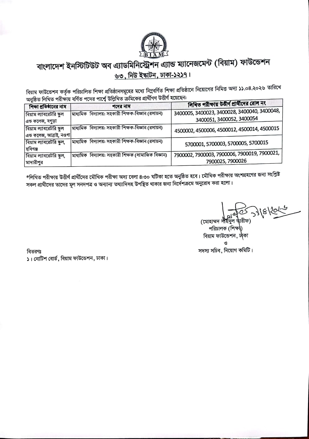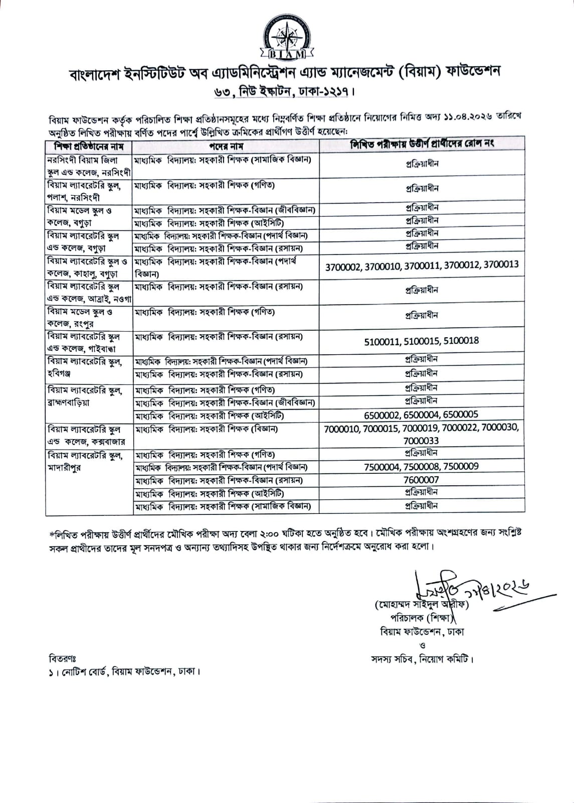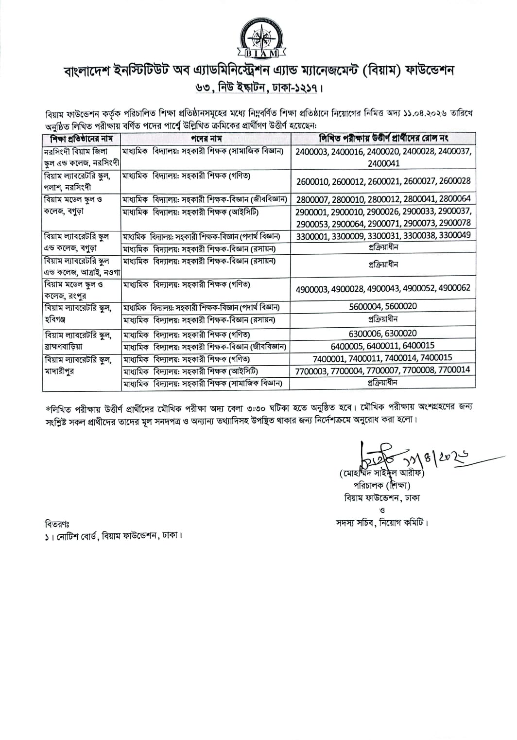 | ৫ | ১০.০৪.২০২৬ তারিখের চূড়ান্ত ফলাফল (বিয়াম ফাউন্ডেশন পরিচালিত শিক্ষা প্রতিষ্ঠানের জনবল নিয়োগ পরীক্ষা) | | | ১১-০৪-২০২৬ | দেখুন |